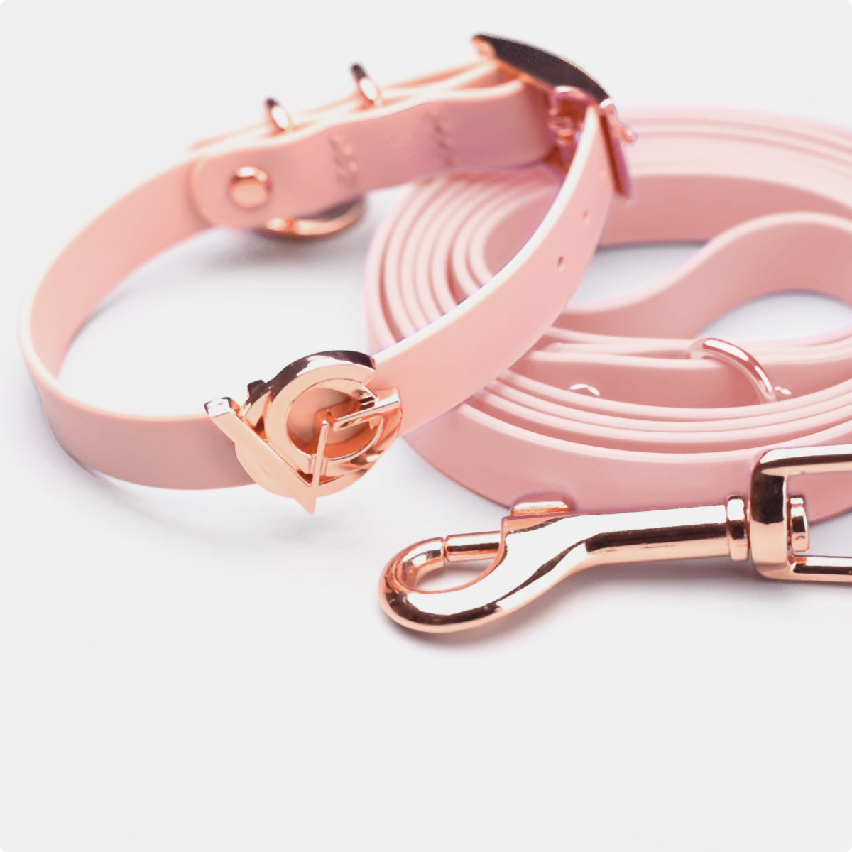 Be the envy of the neighborhood when you and your fur baby step out for a walk with this designer dog collar and leash set from Valgray for Dogs. Showcasing your passion for fashion, this set features bands in blush pink, complimented by name tag, iconic VG® slider brooches and fittings in rose gold. With options for dog breeds sized extra-small to large and made from highest sports-grade PVC-coated nylon webbing, this set isn’t just fashionable its functional too. Proudly animal friendly and